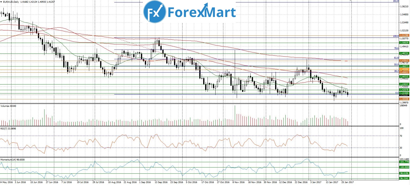 Валютная пара евро/австралийский доллар сформировала серию “доджи” в зоне минимумов возле уровня 1.4150, сегодня мы видим повторный тест указанной черты. Это означает, что на данный момент существует большая вероятность пробоя уровня и дальнейшего снижения к 1.4050. Экспоненциальная средняя с периодом 20 сместилась к линии 1.4200, выше которой пара не поднималась уже 13 торговых дней и является сейчас сильным уровнем поддержки за которым можно располагать стоп-лосы, выставляя ордера на продажу.