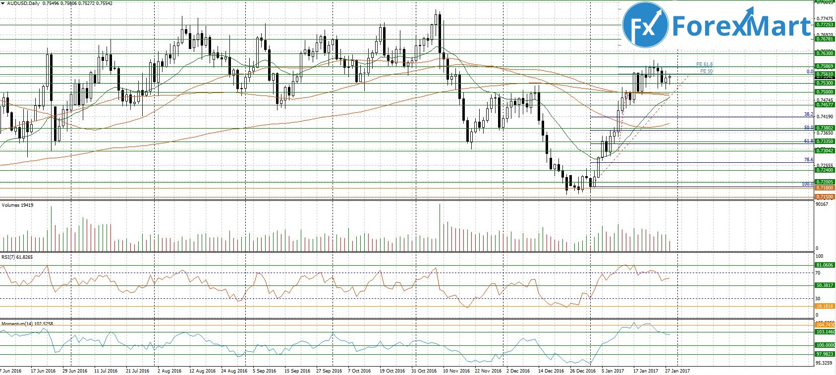 Валютная пара австралийский доллар/доллар США прошедшую неделю завершила паттерном “внутренний бар” от уровня 0.7530, сегодня пара торгуется в узком диапазоне в районе 0.7560. Важных экономических новостей по Австралии на этой недели немного, Китай празднует новый год по лунному календарю вплоть до пятницы, когда опубликуют индексы деловой активности? так что весь фокус внимания на Соединенные Штаты, которые будут определять направление движения. Скорее всего мы увидим попытку доллара отыграть позиции, потерянные за 4 прошедших недели.